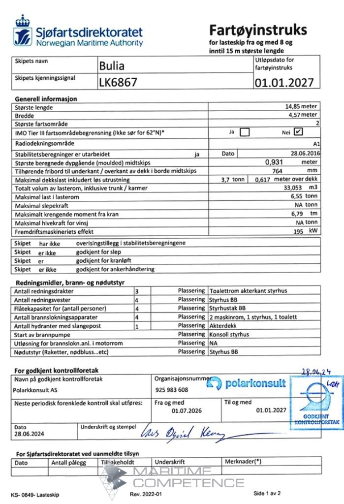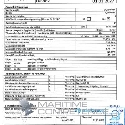 Diverse opplysningerBåt brukt på oppdrettsanlegg til frakt av fôr, utsett og skift av not, avlusingsoperasjoner og diverse forefallende.